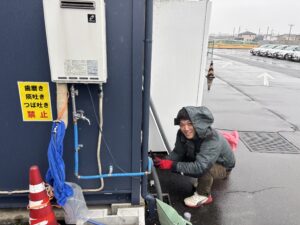 給湯器の配管修繕工事を行いました!入社1年ちょいの彼が無事任務遂行しました。冷たい雨の中お疲れ様!メレ・カリキマカ〜♡
